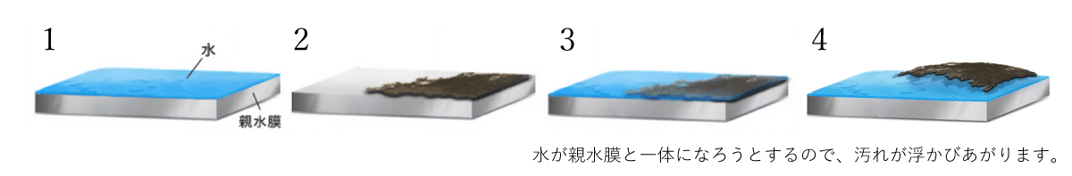 この性質を利用することで、雨水等の水分がコーティングの被膜となじむように汚れと塗装の間に侵入することで、塗装面に付着した汚れの固着を防止するとともにイオンデポジットの固着も防止することが出来るというメカニズムです。