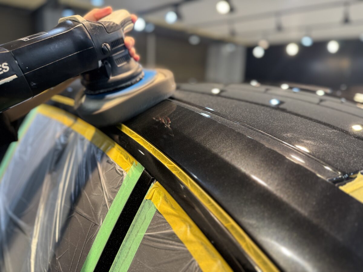 大きめな傷や深めの傷、そしてウォータースポットなどを初期研磨で調整を行い、再度コンパウンドやバフなどを変更し人間の目のレベルでは視認出来ないところまで磨き上げていきます。