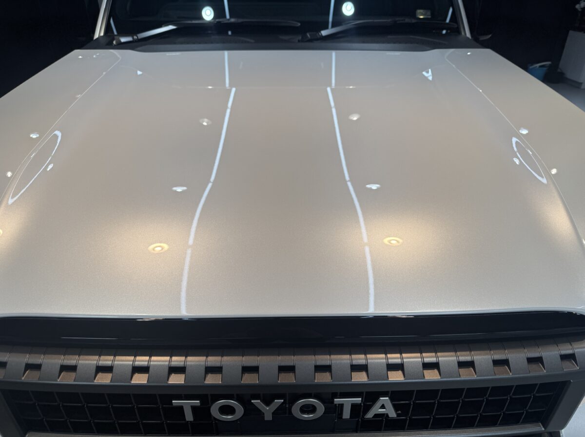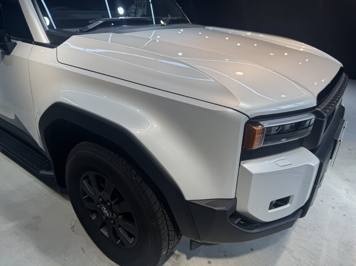 研磨前はボソボソですが、きっちり計算した上で塗装面の調整を行いますと、新車時特有のボソボソ肌がかなり改善されます。全体をこの様にすることで、新車以上の輝きになり圧倒的存在感を放つランクル250になります。